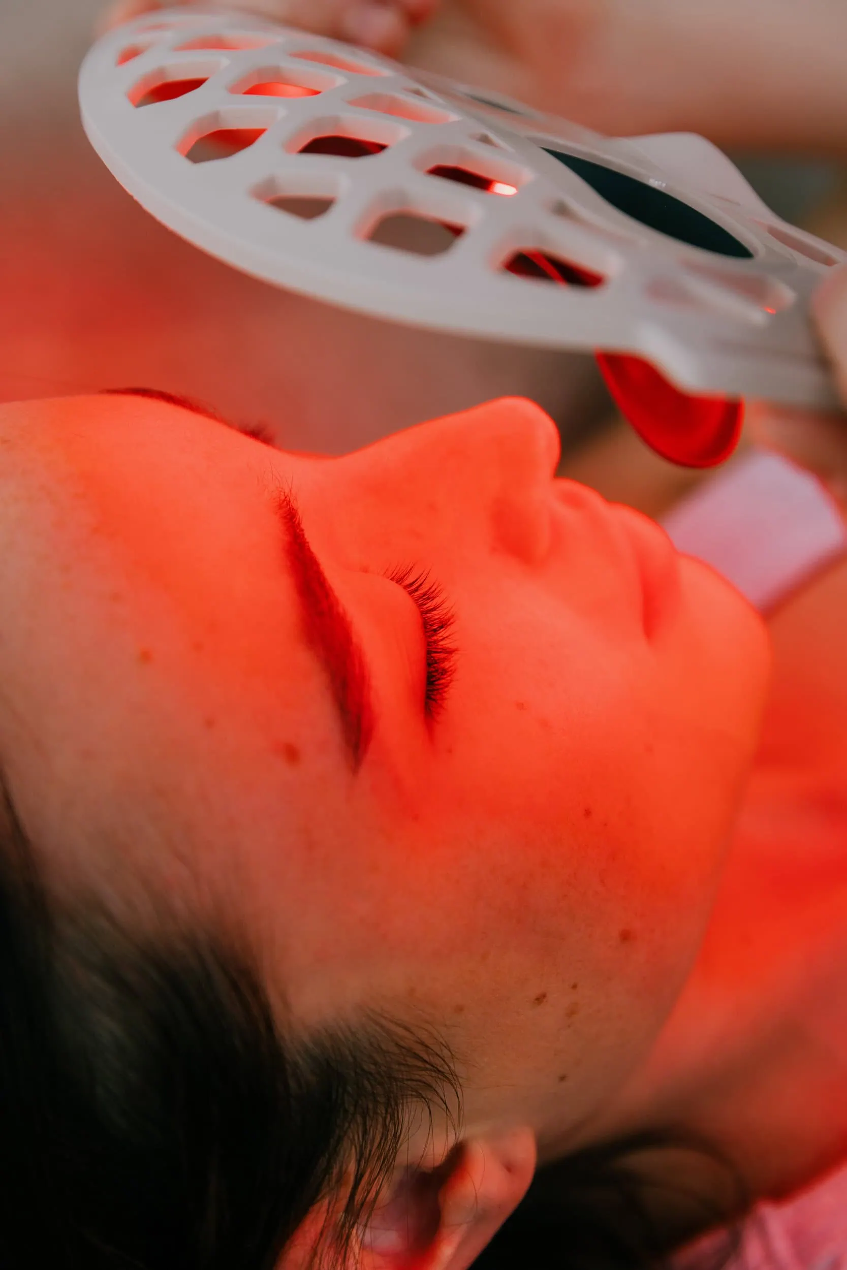 🔴 Rött + Nära-IR ljus (630 + 850 nm) — För hud med ålderstecken. Stimulerar fibroblaster att producera mer kollagen och elastin. (32 mW/cm²)